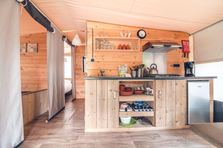La Tentvilla offre ben 3 camere da letto, un bagno con doccia, lavabo e wc, un'accogliente area salotto e una cucina attrezzata (senza lavastoviglie o microonde). C'è anche una spaziosa terrazza coperta che ti permetterà di goderti una meritata vacanza all'aperto anche di sera! La superficie totale della Tentvilla è di ben 60 m2 (10 x 6 metri), di cui la tenda stessa è di 45 m2 e la terrazza coperta di 15 m2. Ci sono 1 camera con un ampio letto matrimoniale, 1 camera con un letto a castello e 1 camera con 2 letti singoli. Le Tent Villas dispongono di aria condizionata nella zona giorno per il riscaldamento e il raffreddamento.