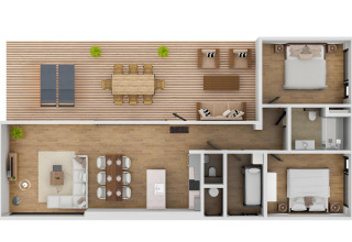 La Bos Villa dispone di tre camere da letto confortevoli con letti già preparati (opzionale). La disposizione comprende due camere con ciascuna un letto boxspring largo 160 cm e una cameretta con un letto a castello. Inoltre, c’è un bagno moderno con doccia a filo pavimento e un WC separato. Il soggiorno accogliente è dotato di pareti in pelle, TV a schermo piatto, Wi-Fi gratuito e aria condizionata sia per raffrescamento che per riscaldamento. La cucina a vista di lusso è completamente attrezzata con forno a microonde combinato, piano cottura a induzione a 4 fuochi, frigorifero con congelatore, lavastoviglie e rubinetto per acqua bollente. Grazie alle ampie finestre, l'interno godrà di molta luce naturale, e all’esterno potrai rilassarti sulla spaziosa terrazza, in parte coperta, per goderti le lunghe serate estive o una colazione vista bosco.