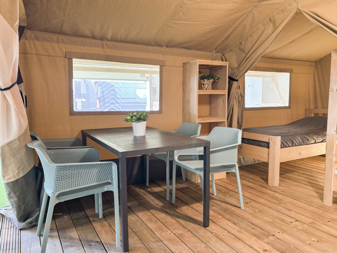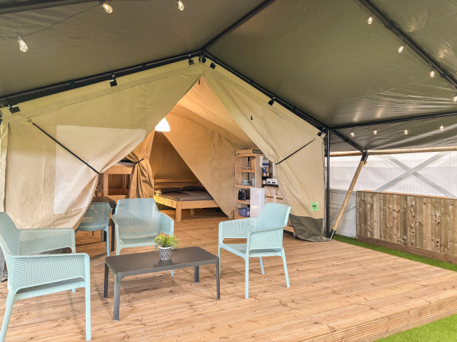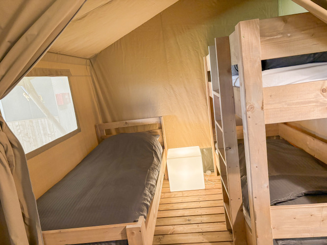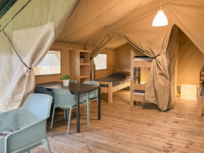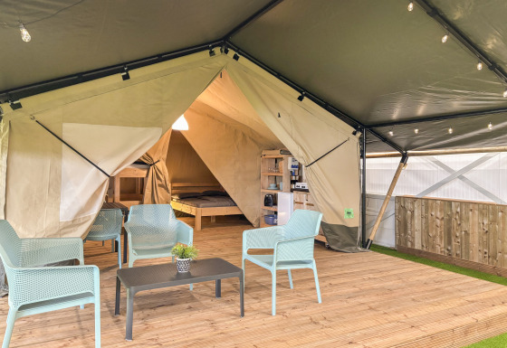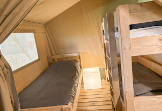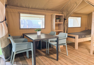 Questa esclusiva Safaritent è completamente arredata per una perfetta vacanza glamping! La tenda dispone di una veranda accogliente con una tettoia, così puoi goderti comodamente la vita all'aperto. C'è una cucina completamente attrezzata con utensili e un fornello a gas quadrupla sicurezza che può essere spostato all'esterno. Ideale per cucinare all'aperto! Inoltre sono presenti un frigorifero, una macchina del caffè e un bollitore. La Safaritent dispone anche di due cabine letto. Una cabina letto ha un letto matrimoniale e l'altra cabina letto ha un letto singolo e un letto a castello. Tutti i letti sono dotati di coperte e cuscini. *Attenzione! Le foto utilizzate sono foto di marketing. La situazione reale può differire leggermente.