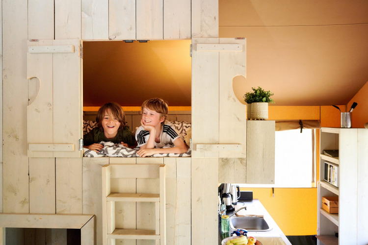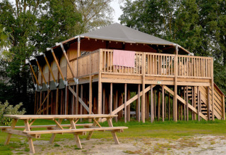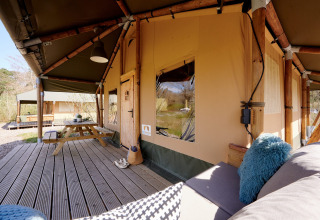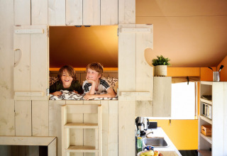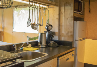 Dormire in altezza acquista un tocco speciale in questa casa sull'albero safari. Con i suoi dettagli in legno e il fronte arrotolabile, vivrete la vera vita all'aperto. La veranda con tettoia invita a stare insieme all'aperto, mentre la cucina completamente attrezzata con lavastoviglie, piano cottura, frigorifero con congelatore e macchina da caffè offre tutto per la massima comodità. La sistemazione dispone di due cabine letto e un accogliente letto a castello con spazio gioco e deposito sottostante. Tutti i letti sono dotati di cuscini e coperte. Infine, il bagno privato con doccia, WC e lavabo completa l'esperienza di glamping di lusso.