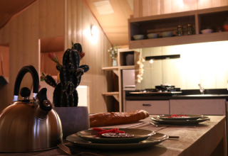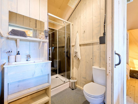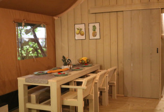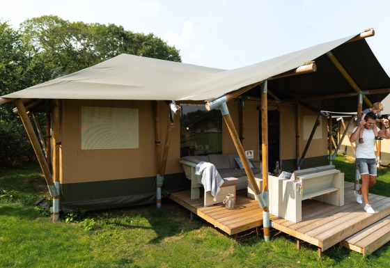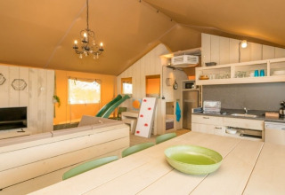 Questa unica Safaritent Medley è dotata di ogni comfort per una vacanza glamping perfetta! Grazie ai dettagli in legno e alla parte anteriore arrotolabile, si percepisce la vera sensazione di stare all'aria aperta tipica del campeggio. La tenda dispone di una veranda accogliente con tettoia, per godere di piacevoli momenti all'aperto, mentre all'interno c'è una comoda zona soggiorno con televisione. La Safaritent ha una cucina completamente attrezzata con inventario e include un fornello a gas sicuro a quattro fuochi, un frigorifero, una macchina da caffè e un forno a microonde. Sono presenti due cabine letto e un letto a soppalco nella tenda. In una delle cabine letto si trova un letto matrimoniale (140x200 cm), nell'altra c'è un letto a castello e un letto a soppalco. Tutti i letti includono coperte e cuscini. Sopra il letto a soppalco c'è una divertente zona gioco con scivolo e parete da arrampicata. La Safaritent è inoltre dotata di un bagno privato con doccia, WC e lavabo.