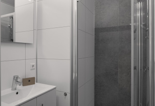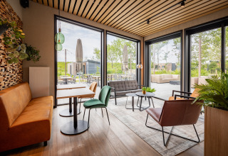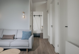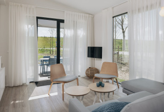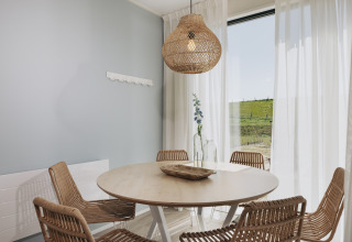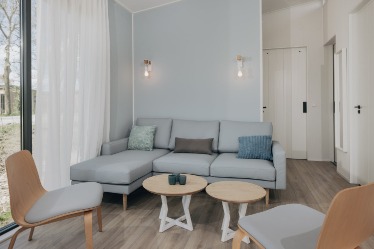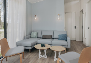 La lodge indipendente è luminosa, elegante e sorprendentemente spaziosa – perfetta per un massimo di sei persone. Nel soggiorno accogliente puoi rilassarti sul divano, guardare una serie sulla smart TV o giocare fino a tarda notte. La cucina open space dal design moderno è completamente attrezzata con microonde combinato e lavastoviglie, così cucinare insieme è facile e nessuno rimane bloccato a lavare i piatti.