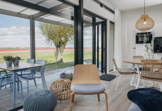Spalanca le grandi porte del giardino e accedi alla terrazza coperta. Questo è il luogo ideale per mattine lente con la colazione all’aperto, o un bicchiere di vino mentre il sole tramonta sul Markermeer. Il lodge si trova in un resort tranquillo, a basso traffico e circondato dal verde, così puoi davvero staccare la spina e rilassarti.