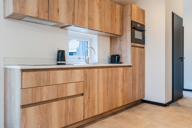 La zona giorno luminosa è accogliente e trasmette tranquillità e comfort, con porte che si aprono direttamente sulla terrazza. La cucina moderna è completamente attrezzata ed ideale per preparare deliziosi pasti. Situata ai margini del bosco, la casa dispone di un comodo divano e un ampio tavolo da pranzo, perfetti per serate di giochi in compagnia o lunghe cene rilassanti con famiglia e amici.
