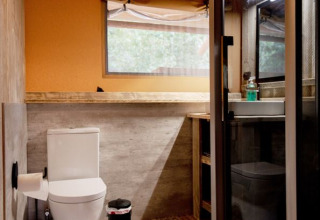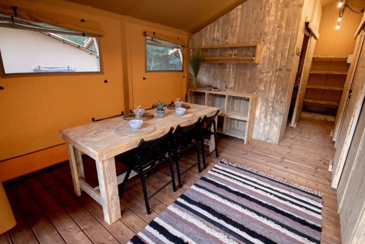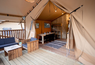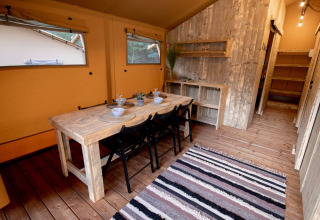 Questo spazioso lodge è ideale per chi desidera soggiornare comodamente con la sensazione di vivere all'aperto. Grazie alla parte anteriore completamente apribile, d'estate puoi portare l'atmosfera esterna all'interno, creando uno spazio abitativo luminoso e aperto. Il lodge è arredato in modo pratico con molto spazio per riporre gli oggetti e un'accogliente zona soggiorno con tavolo da pranzo.