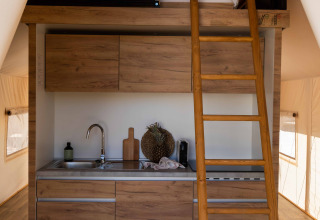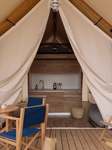 Questa elegante tenda glamping combina la vita all'aperto con il comfort di casa. Adatta per 4 persone e dotata di aria condizionata, bagno privato e cucina completamente attrezzata. Nella camera principale c’è un letto matrimoniale (1,60 m) e sul soppalco trovi un secondo letto matrimoniale (1,40 m) – ideale per famiglie o coppie.