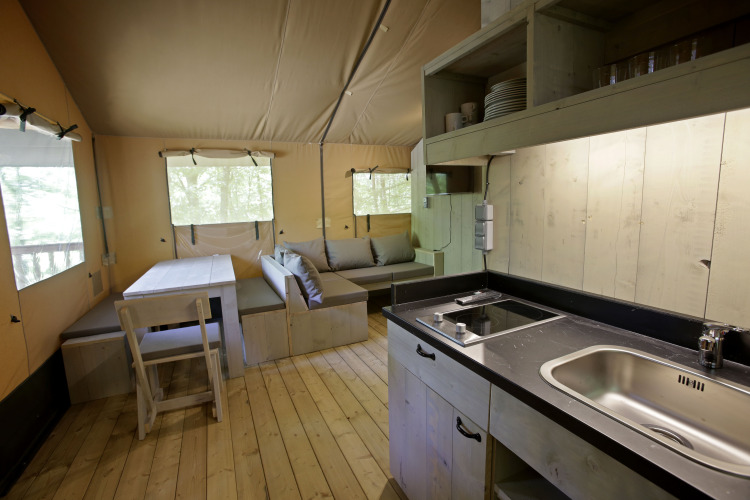La tenda può ospitare cinque persone, con un letto matrimoniale, tre letti singoli e un comodo divano. All'interno troverai anche una TV, una cucina con frigorifero, microonde e macchina per il caffè e un bagno con lavandino.