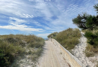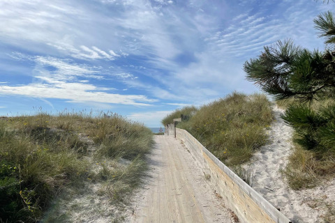 Nel centro della casa troverai un luminoso soggiorno con grandi porte che si aprono su un’ampia terrazza in legno e su un incantevole giardino. Qui puoi rilassarti al sole, goderti una tranquilla colazione all’aperto o rilassarti la sera dopo una giornata in spiaggia o sul campo da golf.