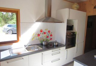 Binnen heerst een warme en huiselijke sfeer. In de woonkamer vind je een knetterende open haard, tv en dvd-speler – ideaal om na een actieve dag tot rust te komen bij een goede film. De moderne keuken is uitgerust met een inductiekookplaat, microgolfoven, vaatwasser en koel-vriescombinatie, zodat je zonder moeite je favoriete gerechten klaarmaakt.