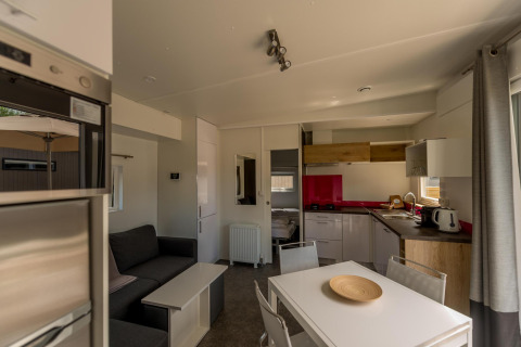 Er zijn twee slaapkamers. De master bedroom heeft een tweepersoonsbed (160 x 200) en een geïntegreerde badkamer met ruime douche, wastafel, haardroger, handdoeken en verzorgingsproducten. De tweede slaapkamer beschikt over twee eenpersoonsbedden (kunnen als dubbel bed gebruikt worden) en een aangrenzende badkamer met douche, toilet en wastafel. De leefruimte heeft een zithoek en een eettafel voor maximaal vier personen. De open keuken is uitgerust met een vaatwasser, een fornuis (vier kookplaten), microgolfoven, Nespresso koffiemachine voor cups en alle nodige keukengerief. Er is geen airco voorzien. Op zonnige dagen geniet je volop op het houten loungeterras met loungeset.