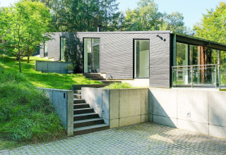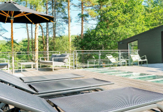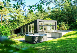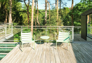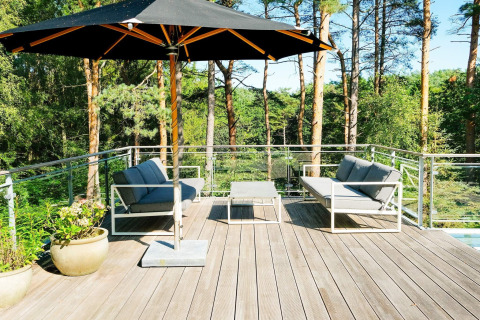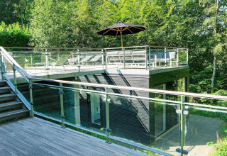Buiten vind je verschillende ruime terrassen, zowel overdekt als open. Er is altijd wel een plekje met zon of net wat beschutting waar je rustig kan ontbijten, lang tafelen of gezellig aperitieven. Door het hellende perceel ligt het huis mooi bovenop een heuvel, wat je dat bijzondere boomhutgevoel geeft. Kijk zeker uit naar bezoek van lokale dieren: reeën en eekhoorns laten zich hier regelmatig in de tuin zien.