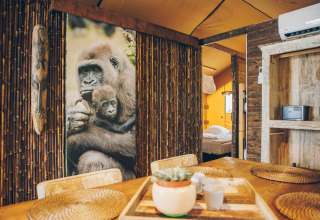 De safaritenten zijn ingericht voor maximaal 5 personen. De safaritenten hebben 2 slaapkamers. In de ouderslaapkamer vind je een tweepersoonsbed en in de tweede slaapkamer een eenpersoonsbed en een stapelbed. Alle tenten zijn ingericht in Afrikaanse stijl. Iedere safaritent heeft een thema uit de natuur van Afrika in de vorm van een dier! Hoe geweldig is dat? Overnacht tussen de Neushoorns, Gorilla's, Nijlpaarden of Giraffes.