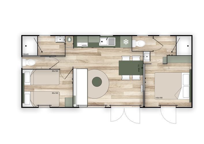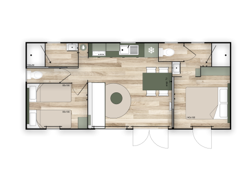 Ontspan in een ruime en moderne premium vakantiewoning van 35 m², helemaal ingericht voor jouw comfort en rust. Geniet van twee slaapkamers, twee badkamers en omkeerbare airco – perfect in elk seizoen. Beleef het buitengevoel op een groot, deels overdekt XL-terras dat als een extra leefruimte aanvoelt. Relax in de lichtrijke leefruimte met televisie en verwarming, en kook zorgeloos in de volledig uitgeruste keuken met vaatwasser, koelkast met diepvriesvak, microgolf, koffiezet, waterkoker en broodrooster. Slaap zalig in een tweepersoonsbed van 160 cm of twee enkele bedden van 80 cm, waarvan er één geschikt is als kinderbedje. Twee moderne badkamers met handdoekdroger, haardroger en een apart toilet maken alles compleet. Huisdieren zijn niet toegelaten.