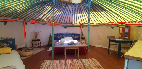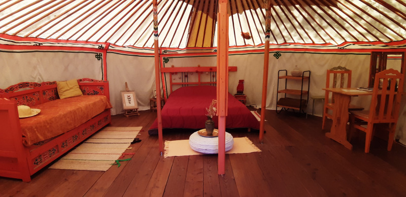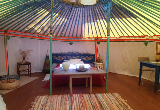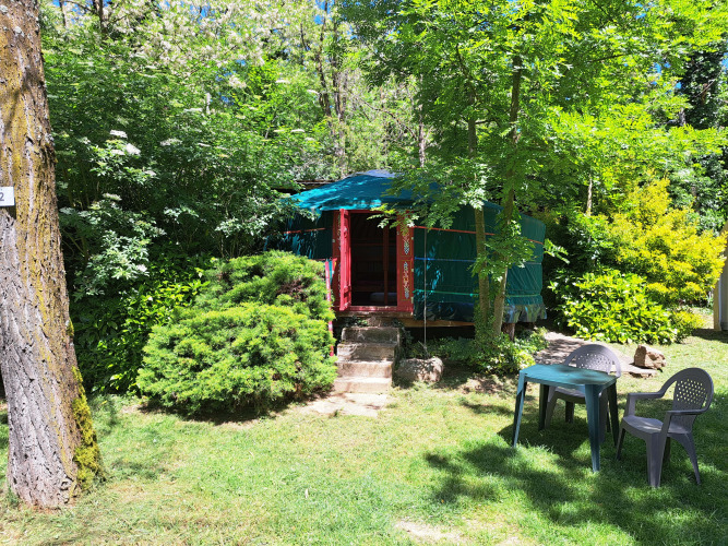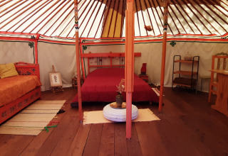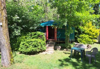 De Joert biedt een unieke en duurzame manier van verblijven in het groene Ardèche. Deze traditionele Mongoolse tent staat op een ruime grasrijke plek, zonnig of schaduwrijk, en past perfect in het natuurlijke landschap aan de rivier. De Joert heeft een oppervlakte van 26 m² en is met de hand beschilderd. Sommige exemplaren zijn bekleed met schapenwol-vilt en katoen, andere met een moderner canvas. Binnen vind je één gezellige leefruimte met een tweepersoonsbed en, afhankelijk van het type, een extra eenpersoonsbed. De inrichting is warm en eenvoudig, met zitkussens, tapijten en een klein eetgedeelte. De keuken is volledig uitgerust met een koelkast met diepvriesvak, kookplaat, microgolfoven, koffiezetapparaat en servies. Er is elektriciteit aanwezig. Voor het sanitair maak je gebruik van de faciliteiten op de camping. Buiten staan er ligstoelen en tuinmeubilair klaar. Het uitzicht op de rivier en de bergen maakt het plaatje compleet.