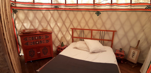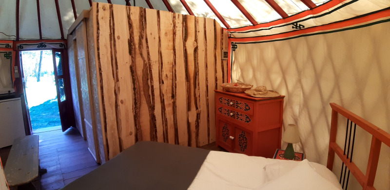 De Joert met badkamer biedt een comfortabele en duurzame manier om te verblijven midden in de natuur. Deze traditionele, met de hand geschilderde Mongoolse yurt past mooi in het rustige landschap van de Groene Ardèche, pal aan de rivier. De joert heeft een oppervlakte van 28 m² en ligt op een ruime, groene plaats met zowel zon als schaduw. Binnenin ervaar je een gezellige, knusse sfeer met veel hout en natuurlijke materialen. Er zijn twee slaapkamers met twee tweepersoonsbedden en een enkel stapelbed. De accommodatie is geschikt voor vijf personen.