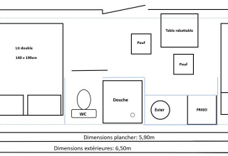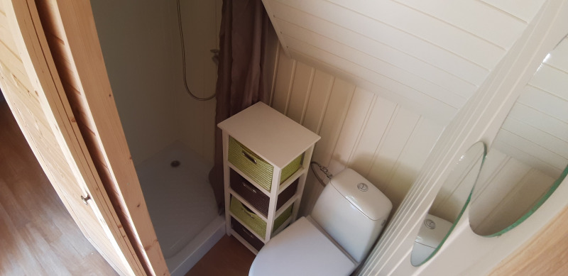Er zijn twee aparte slaapkamers, één met een tweepersoonsbed en één met een stapelbed. In de compacte keuken vind je een gootsteen, een koelkast met vriesvak, een elektrische kookplaat, microgolfoven, koffiezetapparaat en al het nodige servies. De badkamer is uitgerust met een douche en een toilet. Buiten is er een terras van vijf vierkante meter met tuinmeubelen en een ligzetel – ideaal om te genieten van het uitzicht op de bergen en de yurts. Je verblijft op een ruime plek van 150 m² waar één huisdier welkom is tegen betaling van een toeslag. Je kan parkeren bij de hut, maar om veiligheidsredenen is het opladen van elektrische voertuigen niet toegestaan.