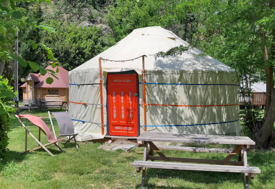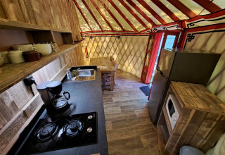 De WOOD Joert biedt een unieke overnachting in een traditionele Mongoolse tent die mooi opgaat in de natuur van de Groene Ardèche. De ronde houten joert staat op een ruime, groene plek van 28 m² met zicht op de rivier en de omliggende bergen. Binnen heb je een lichtrijke leefruimte met een gezellige, natuurlijke sfeer. De joert is geschikt voor vijf personen en heeft twee slaapkamers met twee tweepersoonsbedden en één enkel stapelbed. De volledig uitgeruste keuken heeft een koelkast met diepvries, een kookplaat met twee pitten, een microgolfoven, een koffiezet, en servies. Het glampingmeubilair is volledig gemaakt uit hoogwaardig hout en biedt comfort zonder het contact met de natuur te verliezen. De eigen badkamer zorgt voor extra privacy. Buiten kan je genieten van tuinmeubilair en ligstoelen, ideaal om te ontspannen in de frisse buitenlucht. De met de hand beschilderde houten afwerking en de traditionele materialen, zoals vilt van wol en katoen, geven de joert een authentieke look.