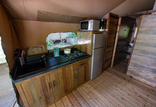 Woonkamer met een ingerichte keuken (volledig servies, gasvuur, microgolfoven, koelkast, diepvries, filterkoffiezet) en een eethoek met tafel, stoelen en een bank.