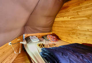 Stel je voor: je slaapt tussen de boomtoppen, in een houten tent met canvas wanden, met een tweepersoonsbed, een stapelbed én een verhoogd terras om de sterren nog beter te bewonderen.