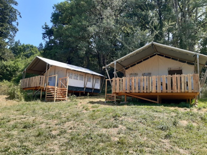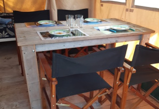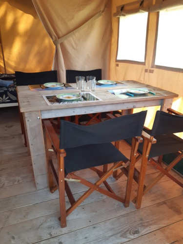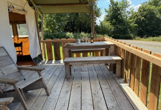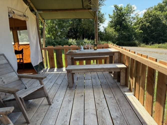 Ervaar het ultieme glampinggevoel in deze safaritent voor 4 personen in Saône-et-Loire, Bourgondië-Franche-Comté. De tent van ongeveer 37,5 m² heeft houten accenten en een oprolbare voorkant voor rechtstreeks contact met de natuur. Twee slaapkamers bieden plaats aan drie bedden: één tweepersoonsbed en twee enkele bedden, allemaal voorzien van dekens en kussens. Buiten vind je een overdekte veranda met luifel, perfect om gezellig te ontspannen of samen buiten te eten. De volledig uitgeruste keuken beschikt over een vierpits gasvuur dat je ook buiten kan gebruiken, een koelkast, koffiezet en waterkoker. Ideaal om buiten te koken! Huisdieren zijn welkom, roken is niet toegelaten. Geniet van een comfortabele vakantie midden in de natuur, waar ontspanning en comfort centraal staan.