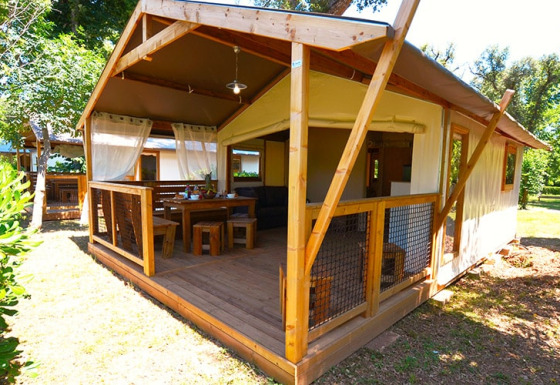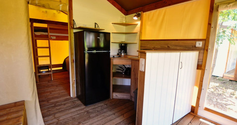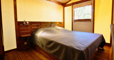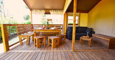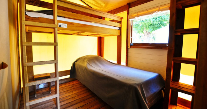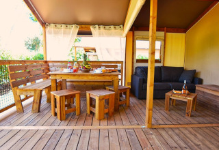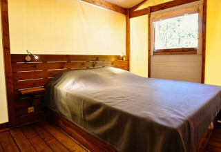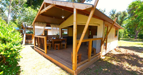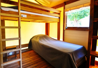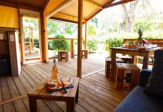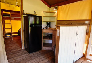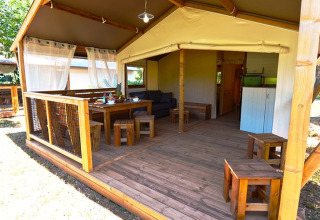 Deze canvas lodge op palen is een unieke en originele accommodatie, volledig opgebouwd uit hout en canvas. De open en lichte constructie zorgt ervoor dat binnen en buiten vlot in elkaar overlopen, zodat je volop kunt genieten van de omgeving.