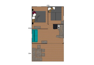 De lodge heeft een praktische en comfortabele indeling met twee slaapkamers, een leefruimte, een volledig uitgeruste keuken en een overdekt terras. De sanitaire voorzieningen bevinden zich vlakbij de accommodatie.