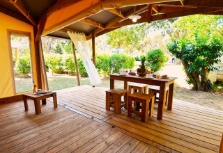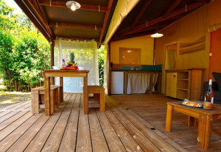 Buiten is er een overdekt terras waar je heerlijk kan ontspannen of samen buiten eten. De sanitaire voorzieningen bevinden zich op wandelafstand van de accommodatie. Beddengoed, dekens en kussens zijn inbegrepen, zodat je zorgeloos kan aankomen en direct kan genieten van je verblijf.