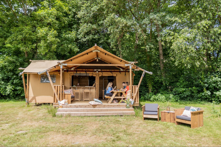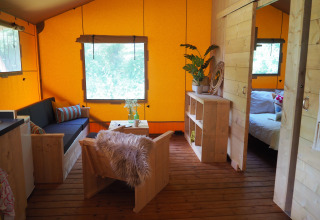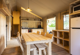 Buiten kan je ontspannen op het terras met tuinmeubilair en een loungeset. Dankzij het eigen sanitair en de uitgeruste keuken combineert deze tent het buitenleven met het comfort van een vakantiewoning. Huisdieren zijn welkom, dus je hond mag gerust mee op vakantie.