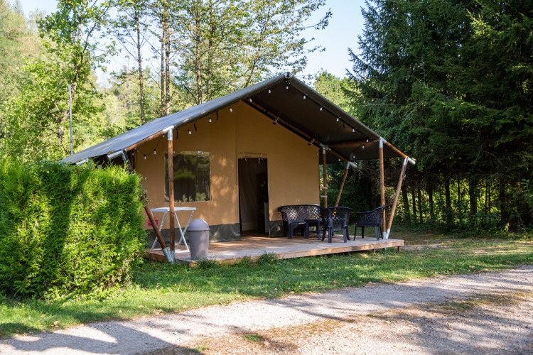 Deze sfeervol ingerichte safaritent, met stahoogte in de volledige tent, is voorzien van een heerlijk ruim terras met luifel. Onder de luifel staat een loungeset met een lage zit en in het woongedeelte een hoge tafel met stoelen die allemaal makkelijk verplaatst kunnen worden.