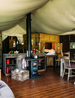 Geen elektriciteit? Dat maakt het juist extra bijzonder! De tent wordt sfeervol verlicht met olielampen en kaarsen, en koken doe je op de houtkachel. Er liggen houtblokken klaar om het lekker warm en knus te maken. Durf jij het aan?