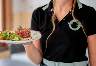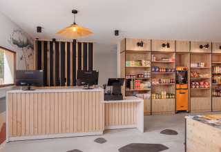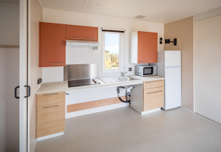 Het gelijkvloerse chalet is slim ingedeeld en volledig voorzien van airco, zodat je het ook op warme zomerdagen lekker fris hebt. In de lichte woonkamer kan je relaxen in de zetel, tv kijken of al plannen maken voor je volgende uitstap. De open keuken is compleet uitgerust met alles wat je nodig hebt: een vaatwasser, een koel-vriescombinatie en een capsule koffiemachine maken het koken en ontbijten extra gemakkelijk.