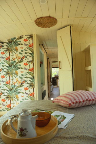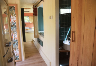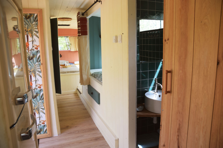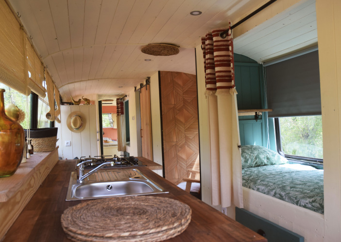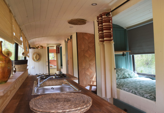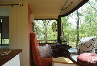 Deze oude schoolbus is omgebouwd tot een unieke en comfortabele verblijfplaats! Deze originele logeerplek heeft een ruime badkamer met een inloopdouche en een lavabo.