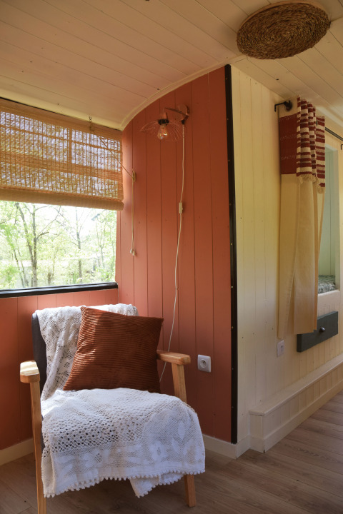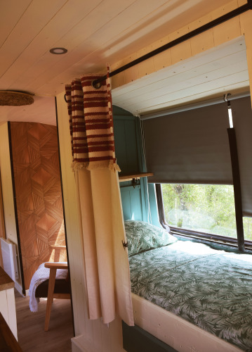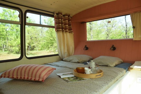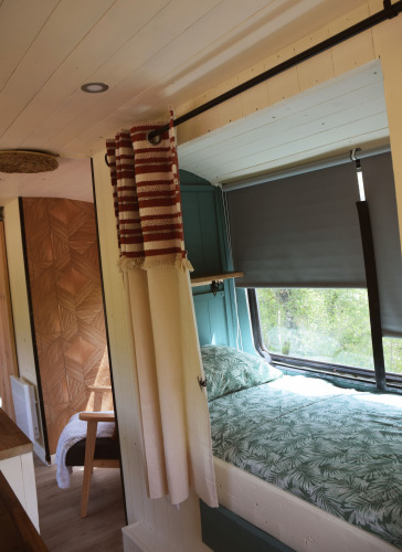Binnenin vind je een zetel, een toilet, een ruime slaapkamer met een tweepersoonsbed van 160x200 cm en twee slaapcompartimenten met bedden van 80x200 cm.