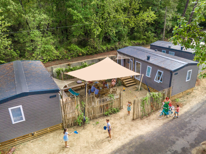 Gelegen in het Tribu-gedeelte, rustig gelegen in het bos aan de rand van de camping. Deze Tribu-accommodaties bestaan uit twee stacaravans die tegenover elkaar staan met een gedeelde buitenruimte, op een plaats van ongeveer 300 m².