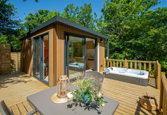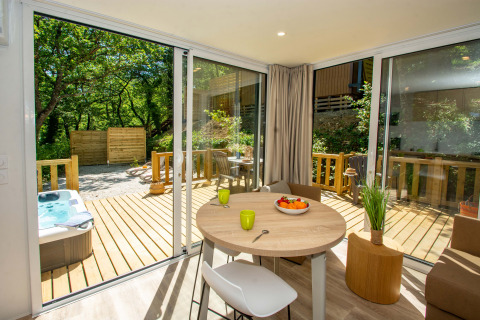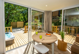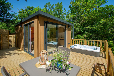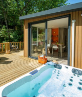 Buiten is er een privé open terras met tuinmeubilair, ligzetels en een eigen jacuzzi. De spa wordt tussen de verblijven grondig gereinigd en opnieuw gevuld.