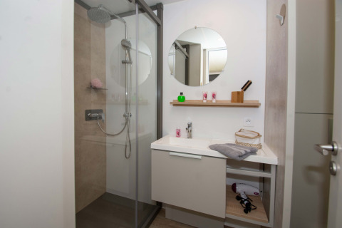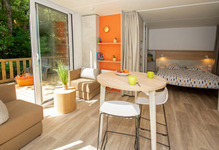 De accommodatie beschikt over één aparte slaapkamer met een tweepersoonsbed van 160 x 190 cm. De open keuken maakt deel uit van de leefruimte en is volledig uitgerust. Er is een koelkast met vriezer, een vaatwasmachine, een microgolfoven, een tweepits kookplaat, een dampkap en een keukenblok met zowel warm als koud water. Verder zijn er een Nespresso koffiemachine, een waterkoker en een broodrooster aanwezig.