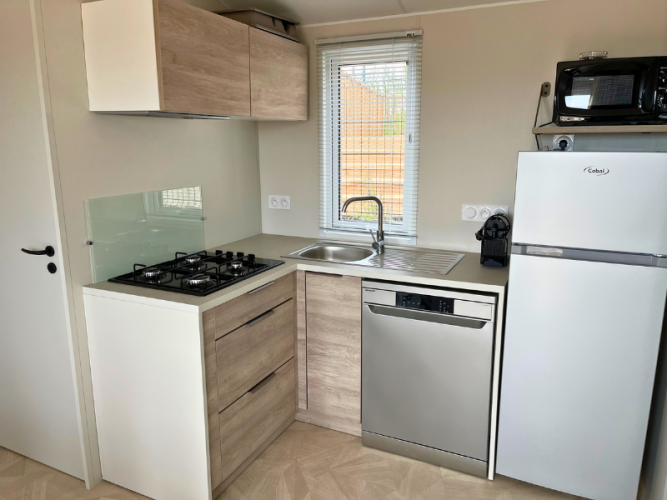 De keuken maakt deel uit van de leefruimte en is volledig ingericht. Er is een keukentje met servies en bestek voor het juiste aantal personen. Je vindt er onder meer een koelkast met vriesvak, een vaatwasser, een kookplaat met vier pitten, een dampkap, een Nespresso-koffiemachine, een waterkoker en een broodrooster.