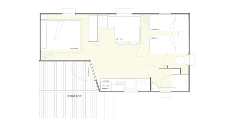 De woning heeft twee slaapkamers: één met een bed van 140 cm en één met twee bedden van 80 cm. Donsdekens en kussens zijn aanwezig; huishoudlinnen kan je optioneel bijboeken.