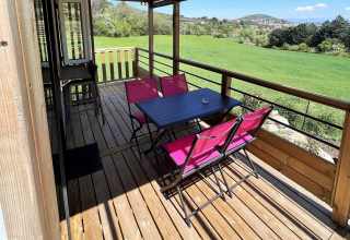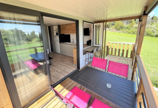 Buiten kan je heerlijk relaxen op het overdekte terras met tuinmeubels en ligzetels, terwijl je geniet van het mooie uitzicht en de rust van de omgeving.