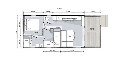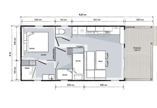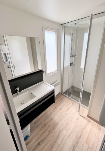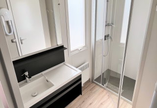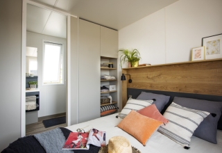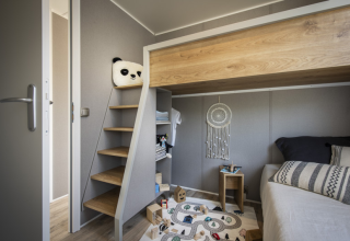 De stacaravan heeft twee slaapkamers: één met een bed van 140 cm en één met twee bedden van 80 cm, waarvan één op een mezzanine. Dekbedden en kussens zijn aanwezig; lakens en handdoeken kan je optioneel bijboeken.