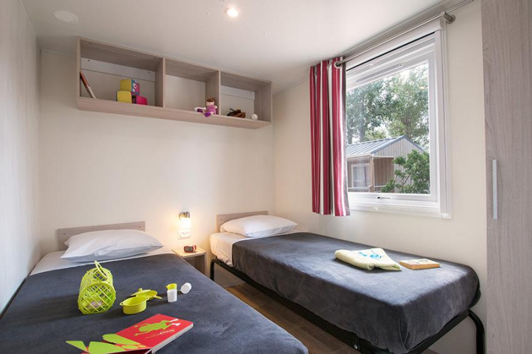 Deze gezellige stacaravan op Camping Beach Garden in Occitanië biedt plaats aan 6 personen. Ook verkrijgbaar als 4-persoons versie. Er is een slaapkamer met een tweepersoonsbed, en twee slaapkamers met telkens twee enkele bedden. In de volledig ingerichte keuken vind je alle nodige benodigdheden, een koelkast, microgolfoven, kookplaat en meer. Geniet van je maaltijd in de leefruimte met zetel, tafel en stoelen. Ook buiten op het terras met tuinmeubilair is het aangenaam vertoeven, ideaal om de dag te starten of af te sluiten. Je beschikt over een badkamer met douche en wastafel, plus een apart toilet. Verwarming en airconditioning zijn ook aanwezig.