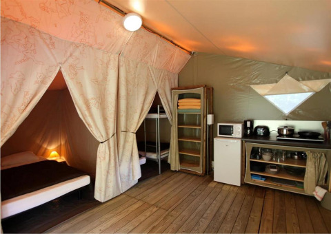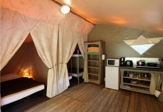 Beleef een onvergetelijke glampingvakantie in de ruime Canada Tent, ideaal voor gezinnen of vriendengroepen. Maak gebruik van uitstekende faciliteiten zoals een groot zwembad, een speelplein voor de kleintjes en allerlei sport- en spelmogelijkheden. Verken de prachtige streek met middeleeuwse stadjes, kastelen, tuinen en spannende buitenactiviteiten zoals kanoën, klimmen en ballonvaren.