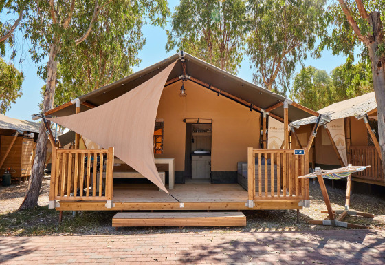 Buiten kan je ontspannen op het terras met een steigerhouten tafel, banken en twee loungezetels. De typische Villatent hangmat maakt het vakantiesfeertje helemaal af. De tenten staan naast elkaar in een groen laantje aan de rand van Camping Spina Family Collection, met uitzicht op het omliggende groen. Je verblijft er op gras met een grindpad voor de tent, en alle campingvoorzieningen zijn makkelijk bereikbaar.