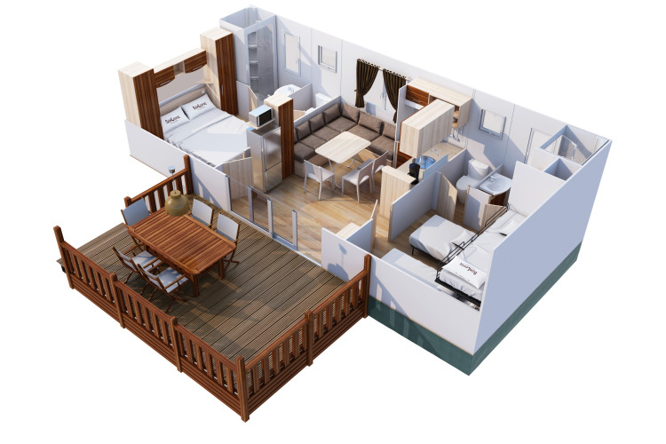 Ontdek de luxe van glamping met de SunLodge Redwood, een ruime mobile home die plaats biedt aan 5 personen. Deze stijlvolle stacaravan heeft twee slaapkamers, twee badkamers en twee aparte toiletten, waardoor je het comfort van thuis ervaart, zelfs op de camping. De slaapkamer met een 2-persoonsbed, de slaapkamer met twee 1-persoonsbedden en een uitklapbed bieden voldoende ruimte voor een gezin of vrienden.