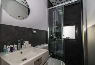 De Camping Villa first row biedt de perfecte combinatie van comfort en functionaliteit voor maximaal vijf gasten. Met 40 vierkante meter woonruimte en een ruim gemeubileerd terras van 25 vierkante meter heb je binnen én buiten volop plaats om helemaal tot rust te komen. Binnen vind je een lichte leefruimte met een LCD-flatscreentelevisie en IPTV-aansluiting. Er is gratis wifi en airconditioning om het steeds aangenaam te houden. In de volledig uitgeruste kitchenette vind je een koelkast, inductiekookplaat, microgolfoven en koffiemachine.