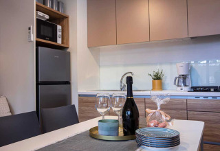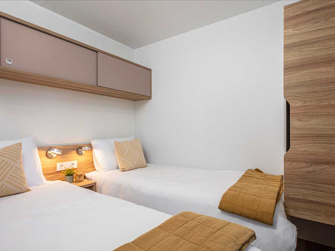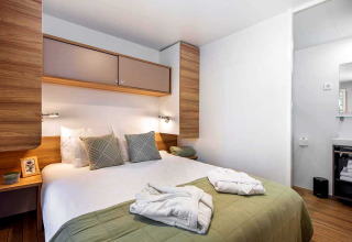 De Porton Pool stacaravan biedt 32 vierkante meter aan comfortabele, moderne leefruimte. Er is een grote slaapkamer met een tweepersoonsbed en een en-suite badkamer. Een tweede slaapkamer beschikt over twee eenpersoonsbedden, en er is een extra badkamer voor extra comfort. De lichtrijke woonkamer heeft een extra bed en geeft uit op een volledig uitgeruste keuken met een koffiezetapparaat, vaatwasser, microgolfoven, broodrooster en al het nodige kookgerei. Buiten vind je een overdekt terras met ligstoelen dat uitkijkt op je privézwembad – ideaal voor ontspannen namiddagen. De woning is voorzien van airconditioning, gratis wifi, satelliet-tv, een kluisje, een haardroger en bed- en badlinnen. Huisdieren zijn welkom.
