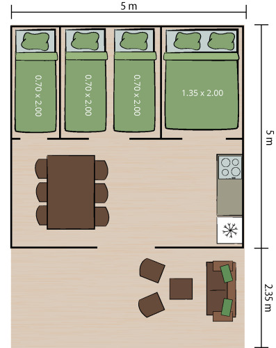 De Safaritent Harmony is gezellig ingericht, ruim en uitgerust met alles wat je nodig hebt voor een ontspannen verblijf. Binnen vind je een volledig ingerichte keuken met een grote koelkast-vriescombinatie, eettafel en veel kastruimte. Een ventilator en verwarming zorgen het hele seizoen voor het nodige comfort. Slapen doe je in drie slaapruimtes: 1× tweepersoonsbed (160×200) en 3× eenpersoonsbedden (80×200). Dekbedden en kussens zijn aanwezig; lakens kan je zelf meenemen of gemakkelijk huren.