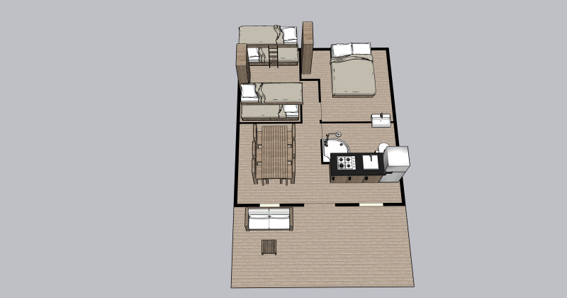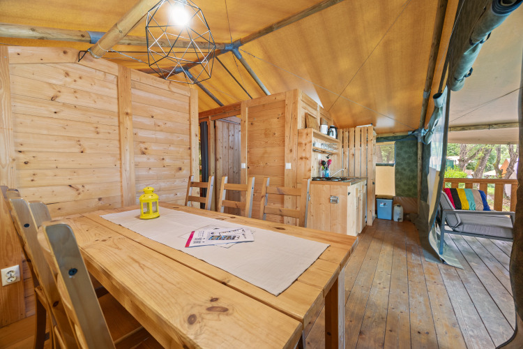 Glamping met het comfort van een hotel én het vrije buitenleven. De Safaritent Sunset (ca. 34 m²) is gezellig ingericht en ligt op een rustige plek, met een eigen badkamer (douche, toilet, lavabo) en airco voor frisse nachten. Binnen: een compleet uitgeruste keuken, eettafel, stoelen en kastruimte. Je slaapt in drie aparte kamers: 1× tweepersoonsbed (160×200) en 2× slaaphoeken met telkens twee stapelbedden (in totaal 4 bedden).