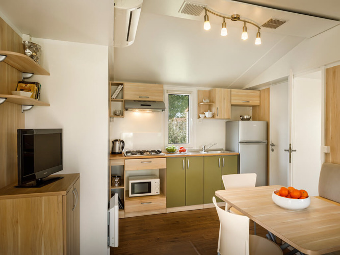 Stap binnen en geniet van een lichtrijke, uitnodigende inrichting met elegante houtaccenten en moderne meubels. De leefruimte met airco beschikt over een comfortabele sofa en een eettafel voor zes personen, en sluit naadloos aan op de volledig uitgeruste keuken. Hier bereid je met gemak lekkere maaltijden dankzij de microgolfoven, waterkoker, koffiezet, koelkast met vriesvak en kookplaat. Dankzij de open indeling, grote ramen en schuifdeuren in glas baadt het huisje in het daglicht en geeft het je een ruimtelijk gevoel.