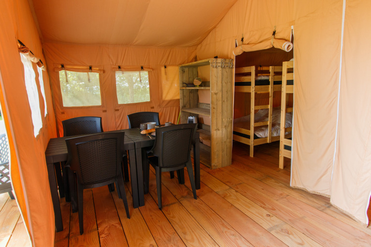 Eet met z'n allen aan de grote tafel met stoelen, gooi de voorkant van de tent helemaal open en geniet extra van het uitzicht en de frisse lucht. De safaritent is voorzien van een heerlijk ruim terras met luifel.
